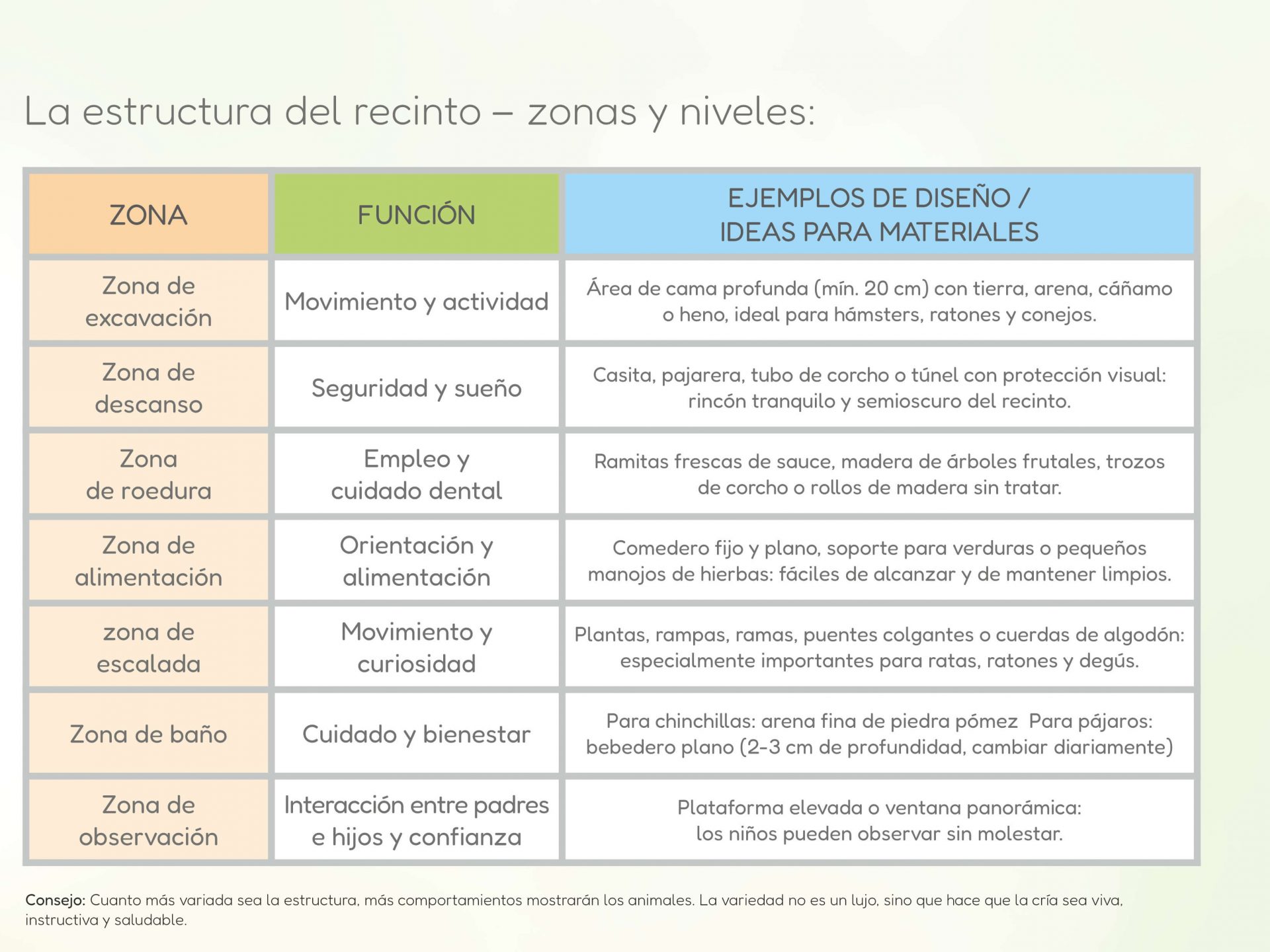- Zonas especiales: cajas de excavación con tierra o arena, material para roer de sauce o corcho, zonas de baño (secas o húmedas), zonas de movimiento y escalada, zonas de retiro y descanso, zonas de alimentación y almacenamiento, zonas de observación y actividad