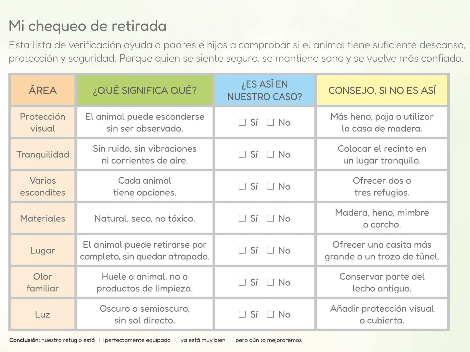Esta lista de verificación ayuda a padres e hijos a comprobar si el animal tiene suficiente descanso, protección y seguridad. Porque quien se siente seguro, se mantiene sano y se vuelve más confiado.