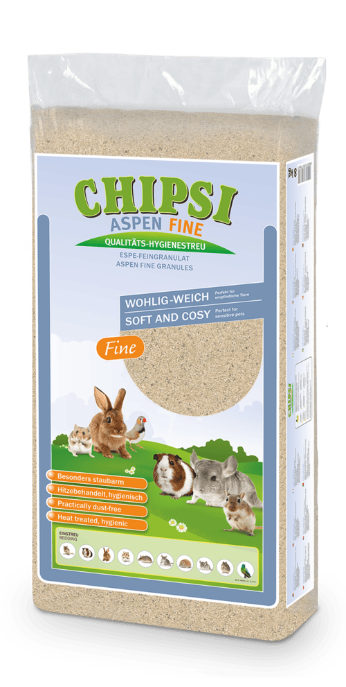 CHIPSI ASPEN FINE es la variante extrafina del probado lecho de álamo temblón, ideal para especies sensibles con vías respiratorias delicadas. Su estructura prácticamente libre de polvo y el tratamiento térmico higiénico garantizan un clima saludable y natural en el hogar de su mascota.